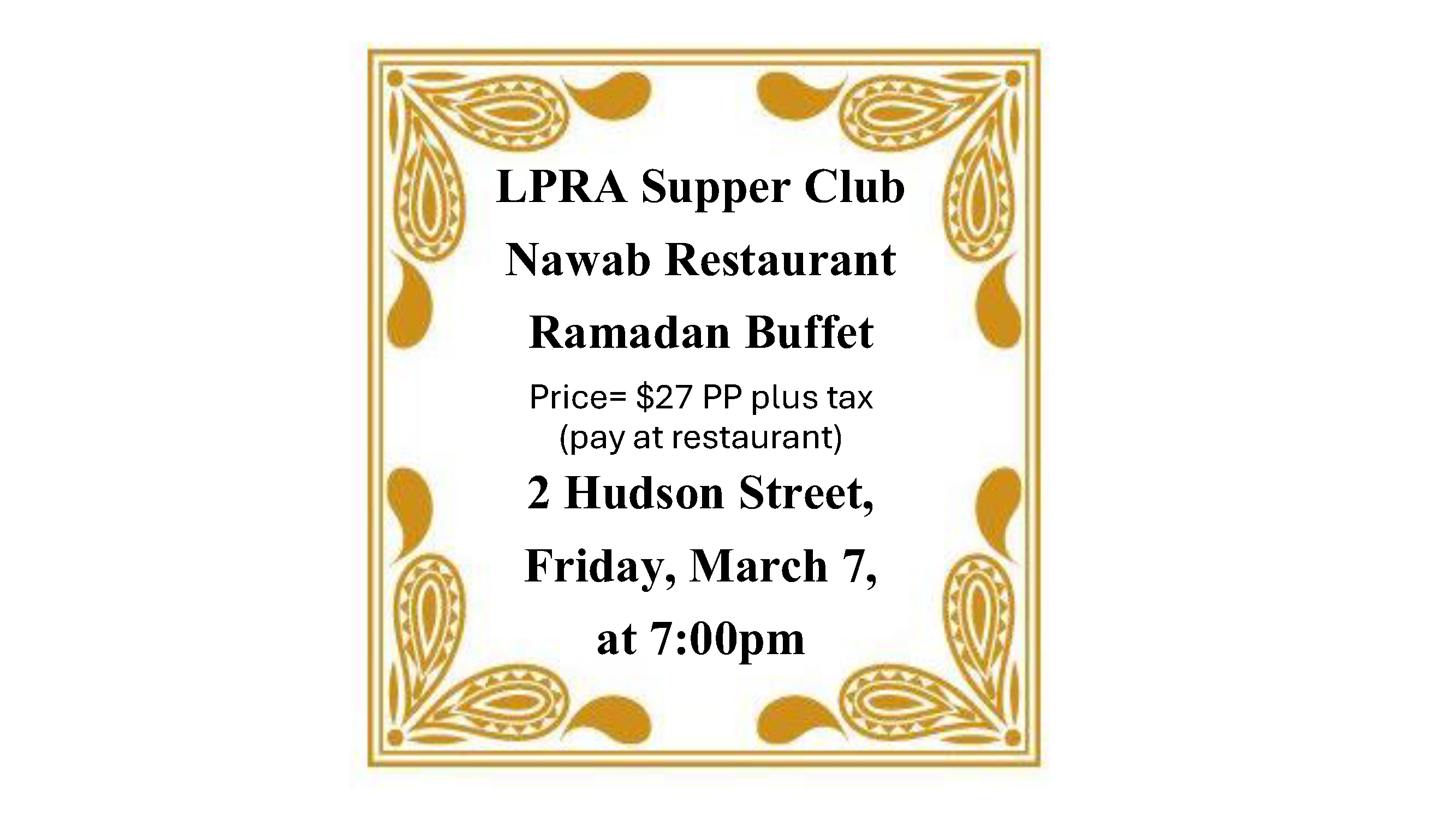 Join us at Nawab Restaurant, 2 Hudson Street, on Friday, March 7, at 7:00pm. Join us for their special Ramadan Buffet. Come solo, with a friend, or your whole family, but please register by March 3 so we can give the restaurant an advance count of the number to expect. This will help make it easier for the restaurant to give us the best experience possible.