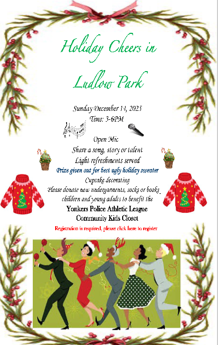 Holiday Cheers in Ludlow Park, gather to enjoy share a song, story or talent Light refreshments served, prize to best ugly holiday sweater; donation drive to benefit the Yonkers Police Athletic League Community Kids Closet